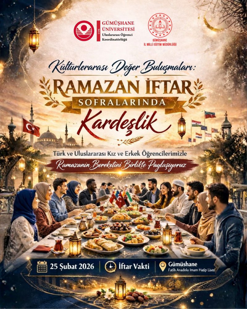 Gümüşhane Üniversitesi Uluslararası Öğrenci Koordinatörlüğü ile Gümüşhane İl Milli Eğitim Müdürlüğü arasında uygulanması planlanan proje kapsamında, kültürel etkileşimi ve dayanışmayı güçlendirmeyi amaçlayan "Kültürlerarası Değer Buluşmaları: İftar Sofralarında Kardeşlik" projesi hayata geçiyor.